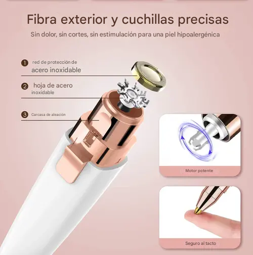 Diseñada para eliminar vello no deseado en cejas, labio superior, barbilla y más, cuenta con cuchillas hipoalergénicas que protegen la piel sensible y una luz LED integrada para máxima precisión.
