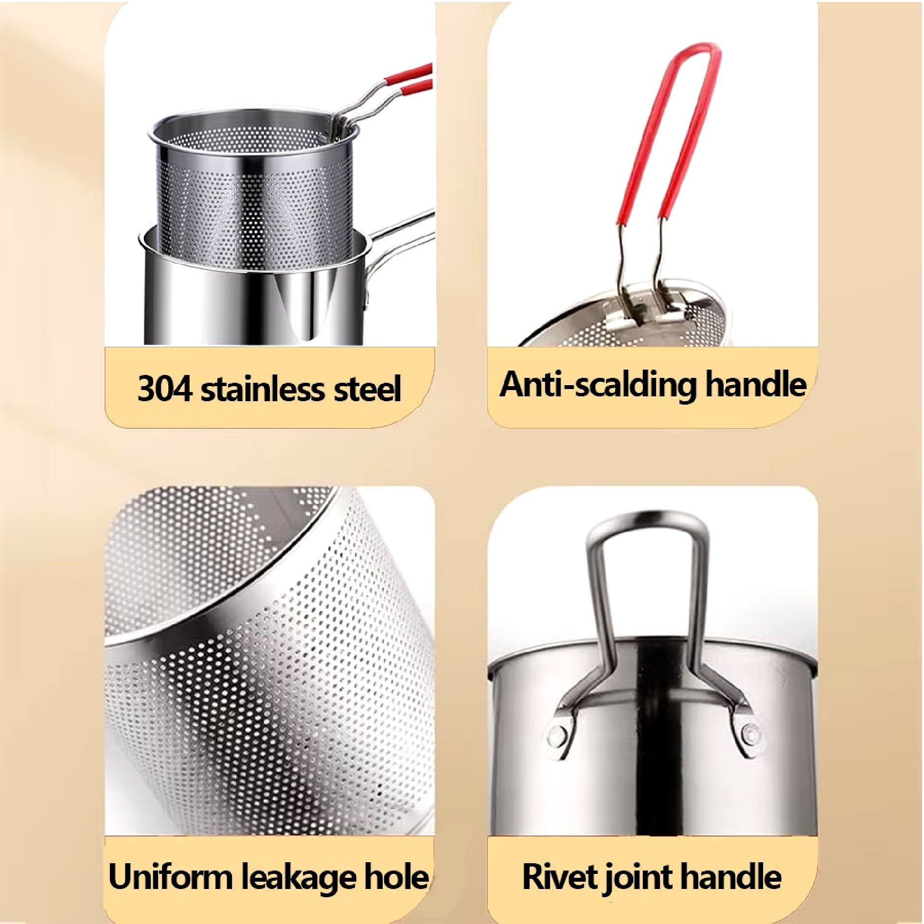 Nuestra olla freidora de acero inoxidable con cesta es la herramienta perfecta para todas tus necesidades de freír. Hecho de acero inoxidable de alta calidad de grado alimenticio, esta olla freidora no solo es duradera, sino también fácil de limpiar.